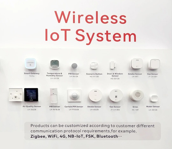 該系列產(chǎn)品主要采用Zigbee無線通訊方式(可根據(jù)客戶需求定制 4G、NB-IoT、ZigBee、WiFi、藍(lán)牙、LoRa等其他通訊方式),由T3網(wǎng)關(guān)統(tǒng)一管理紅外、煙感、氣感、溫濕度、門磁、水浸等前端探測器。