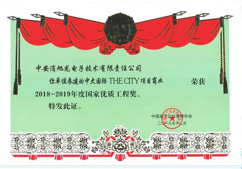 中安科股份子公司中安消旭龍電子技術(shù)有限責(zé)任公司(簡稱旭龍)參建的“中大國際THE CITY項目”摘得“2019年國家優(yōu)質(zhì)工程獎”。