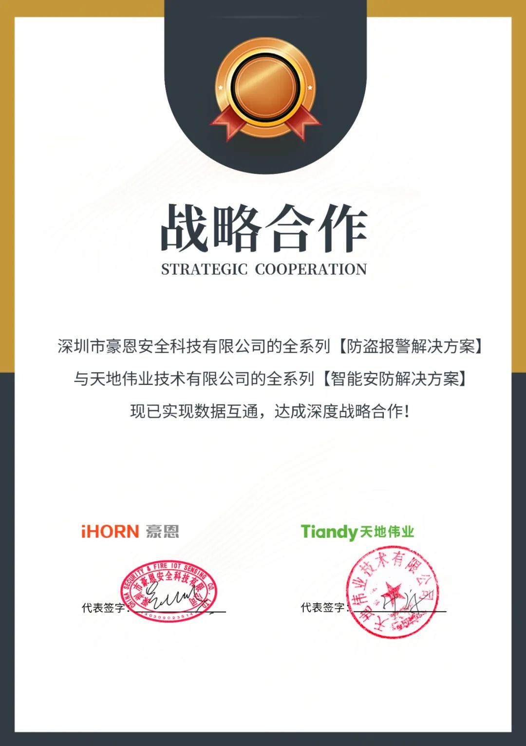 近日,中安科子公司 —— 深圳市豪恩安全科技有限公司(以下簡稱“豪恩”)的全系列防盜報警解決方案與天地偉業(yè)技術有限公司(以下簡稱“天地偉業(yè)”)的全系列智能安防解決方案已實現數據互通,達成深度戰(zhàn)略合作!
