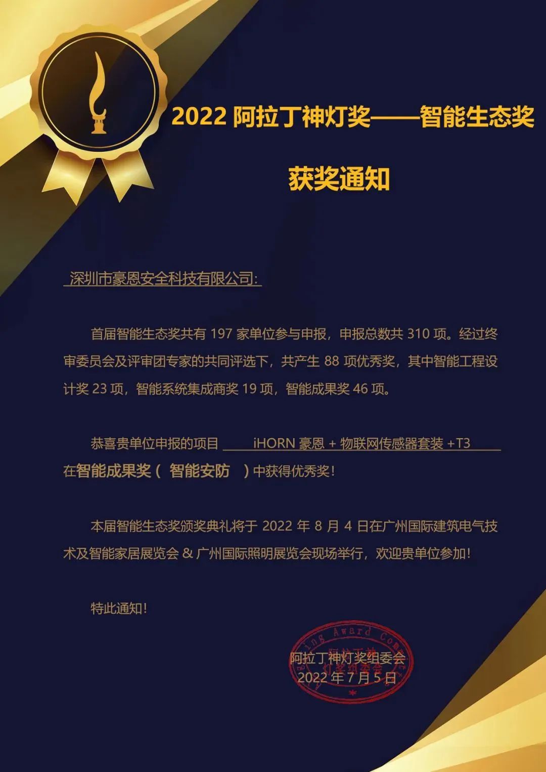 8月4日,豪恩物聯(lián)網(wǎng)傳感器T3系列榮獲“2022阿拉丁神燈獎——智能生態(tài)獎”此前,T3也曾斬獲德國紅點設(shè)計大獎是一套顏值與科技并存、品質(zhì)與性能齊驅(qū)的產(chǎn)品。