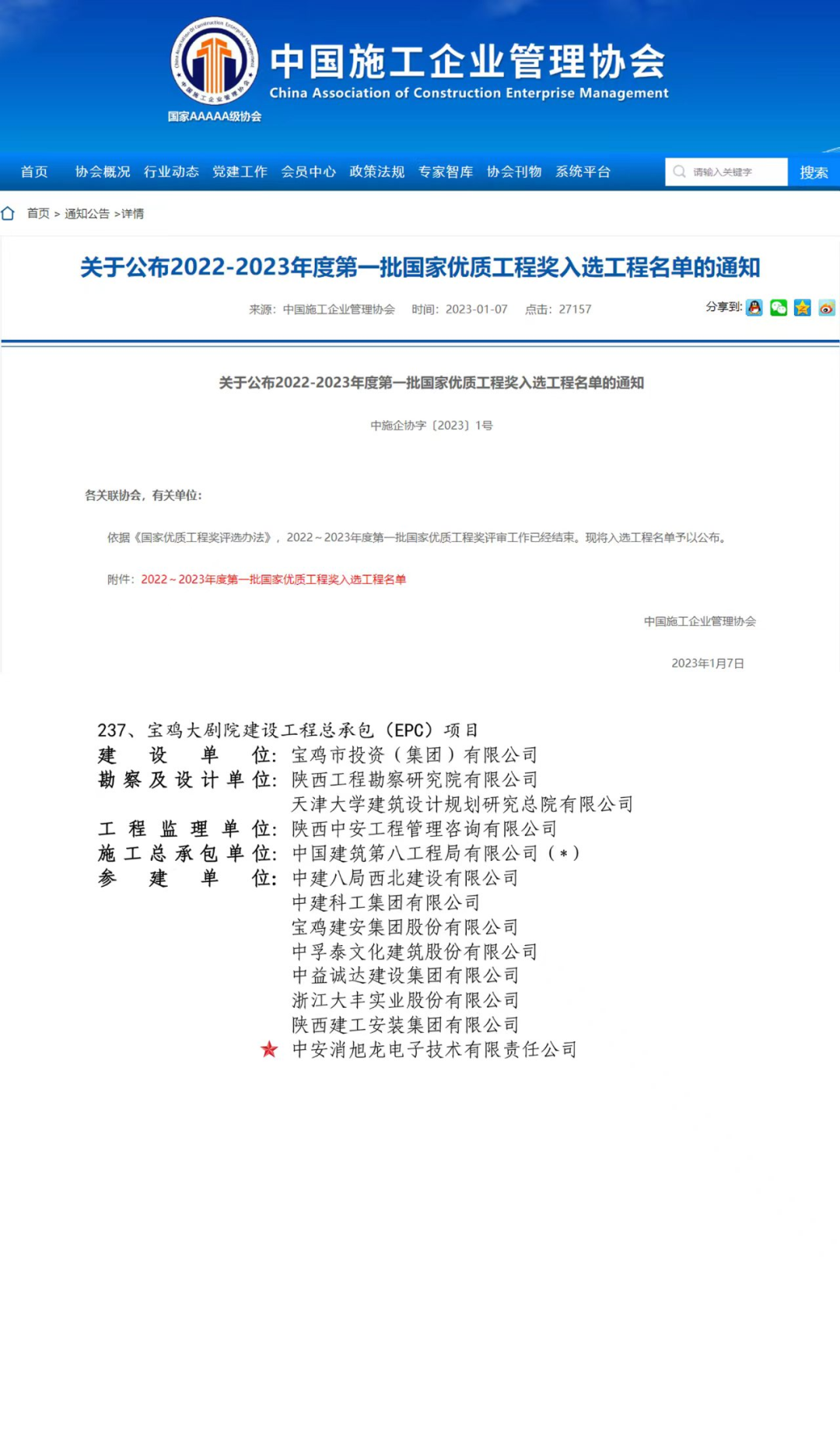2022-2023年度國家優(yōu)質(zhì)工程獎獲獎名單新鮮出爐,中安消旭龍電子技術(shù)有限責(zé)任公司參建的寶雞大劇院建設(shè)工程總承包(EPC)項目榮獲國家優(yōu)質(zhì)工程獎。