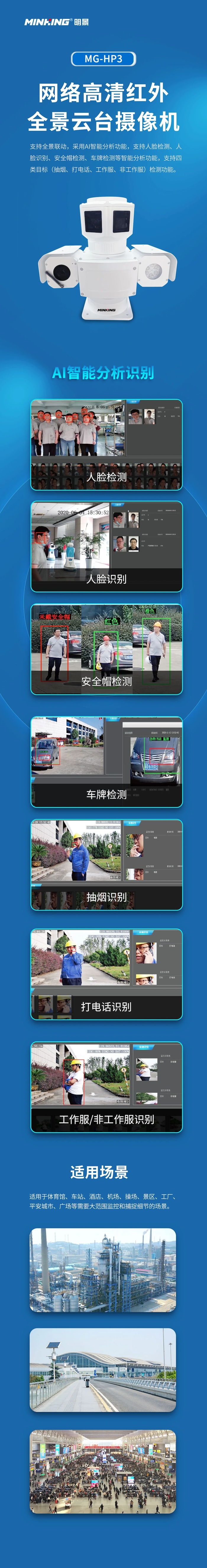 明景此次獲獎(jiǎng)的360度全景4K智能高清5G車載系統(tǒng)(型號(hào):MG-HP3),支持全景聯(lián)動(dòng),采用AI智能分析功能,支持人臉檢測(cè)、人臉識(shí)別、安全帽檢測(cè)、車牌檢測(cè)等智能分析功能,支持四類目標(biāo)(抽煙、打電話、工作服、非工作服)檢測(cè)功能。該產(chǎn)品適用于體育館、車站、酒店、機(jī)場(chǎng)、操場(chǎng)、景區(qū)、工廠、平安城市、廣場(chǎng)等需要大范圍監(jiān)控和捕捉細(xì)節(jié)的場(chǎng)景。